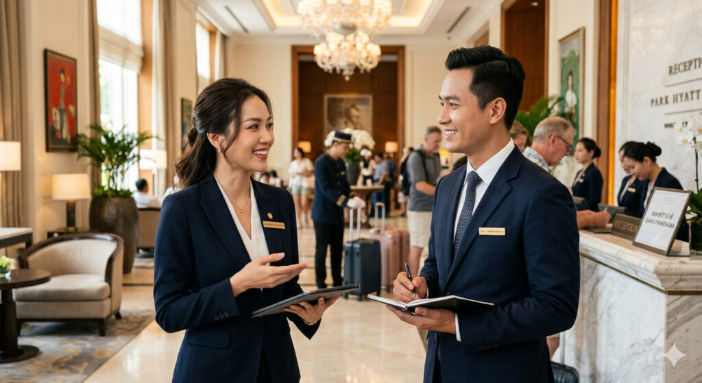 Gợi ý cho người mới: Nếu bạn là sinh viên hoặc người mới ra trường, hãy ưu tiên thực tập tại các chuỗi khách sạn quốc tế như Marriott, Hyatt, Accor hoặc IHG. Các tập đoàn này có chương trình Management Trainee (Quản lý Thực tập sinh) bài bản, giúp bạn luân chuyển qua nhiều bộ phận trong 12–18 tháng và trang bị nền tảng quản lý vững chắc cho sự nghiệp lâu dài.
