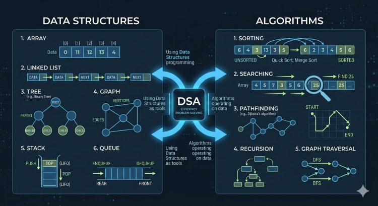 Cấu trúc dữ liệu (Data Structures) là cách sắp xếp dữ liệu trong bộ nhớ máy tính, ví dụ như mảng, danh sách liên kết, ngăn xếp, hàng đợi, cây hay bảng băm. Thuật toán (Algorithms) là tập hợp các bước hữu hạn, có thứ tự, dùng để biến đầu vào thành đầu ra mong muốn, chẳng hạn như sắp xếp một danh sách, tìm kiếm một phần tử hay tìm đường đi ngắn nhất trong đồ thị. Hai khía cạnh này luôn đi đôi với nhau bởi mỗi thuật toán đều thao tác trên một cấu trúc dữ liệu cụ thể, và mỗi cấu trúc dữ liệu chỉ phát huy tối đa giá trị khi được thuật toán phù hợp khai thác.
