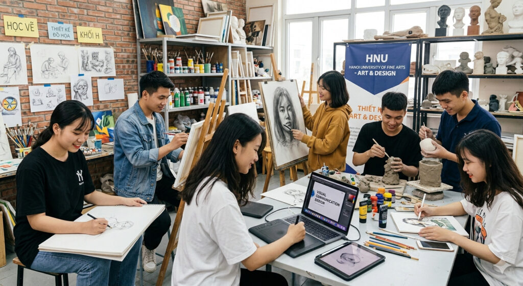 Ngoài các trường đại học chính quy, nhiều học sinh khối H còn chọn du học ngành thiết kế tại Singapore, Nhật Bản, Hàn Quốc – các quốc gia có ngành công nghiệp sáng tạo phát triển mạnh. Học bổng thiết kế/kiến trúc tại các trường như NUS, KAIST, Musashino Art University đang mở rộng cho sinh viên Việt Nam có portfolio tốt.