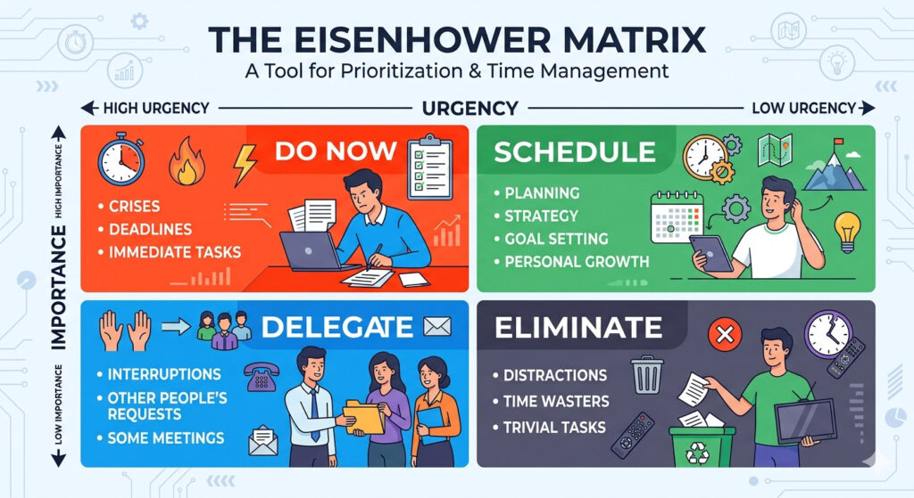 “Tôi có hai loại vấn đề: khẩn cấp và quan trọng. Khẩn cấp thường không quan trọng, và quan trọng thường không bao giờ khẩn cấp.” – Dwight D. Eisenhower