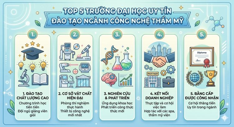 Lựa chọn đúng trường và chương trình đào tạo là bước khởi đầu quan trọng cho người muốn theo nghề thẩm mỹ chuyên nghiệp. Nhóm top 5 trường đại học uy tín đào tạo ngành công nghệ thẩm mỹ tại Việt Nam — từ ĐH Nguyễn Tất Thành, HUTECH, ĐH Văn Lang đến ĐH Y Dược TPHCM và CĐ Y Dược Pasteur — đều có điểm mạnh riêng phù hợp với từng định hướng nghề nghiệp. Hãy ưu tiên kiểm tra chương trình đào tạo cụ thể, cơ sở thực hành và tư cách pháp lý của trường trước khi đăng ký.